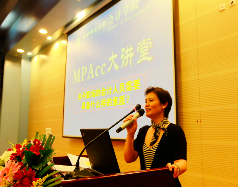 2013年9月15日晚,新葡萄8883官网AMG官网研究生客座导师、中国主权财富基金-中国投资有限责任公司(“中投公司”)财务部副总监陈静女士做客“新葡萄8883官网AMG官网MPAcc大讲堂”,在学术会堂402报告厅做了题为《当今职场的会计人员需要具备什么样的素质》的专题讲座。