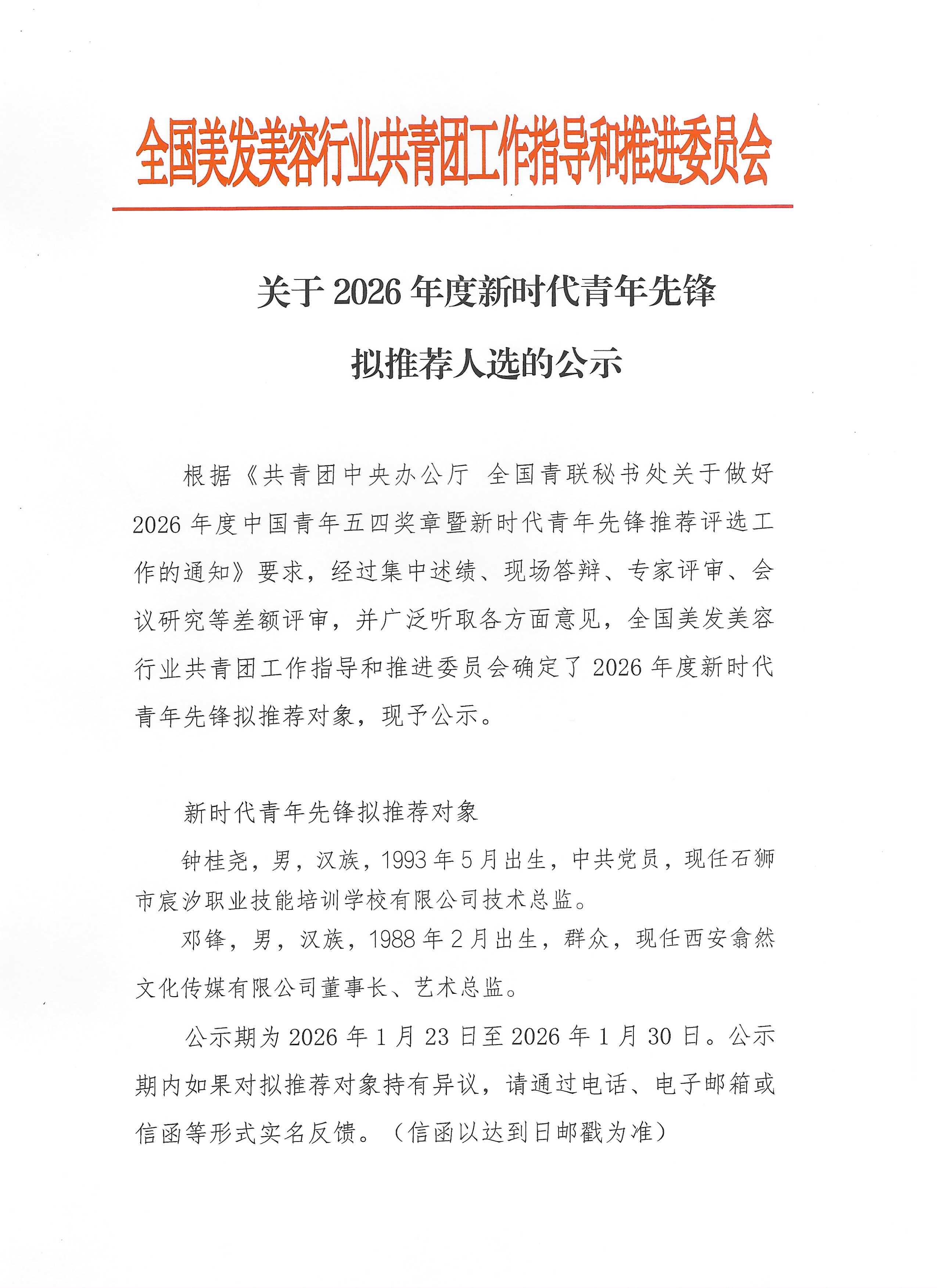 关于2026年度新时代青年先锋拟推荐人选的公示